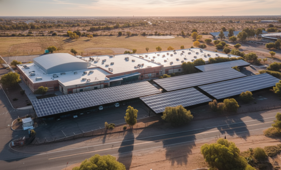 A solar carport system financed through a Power Purchase Agreement to deliver long-term energy savings and shaded parking for a public middle school campus in Tucson, Arizona.